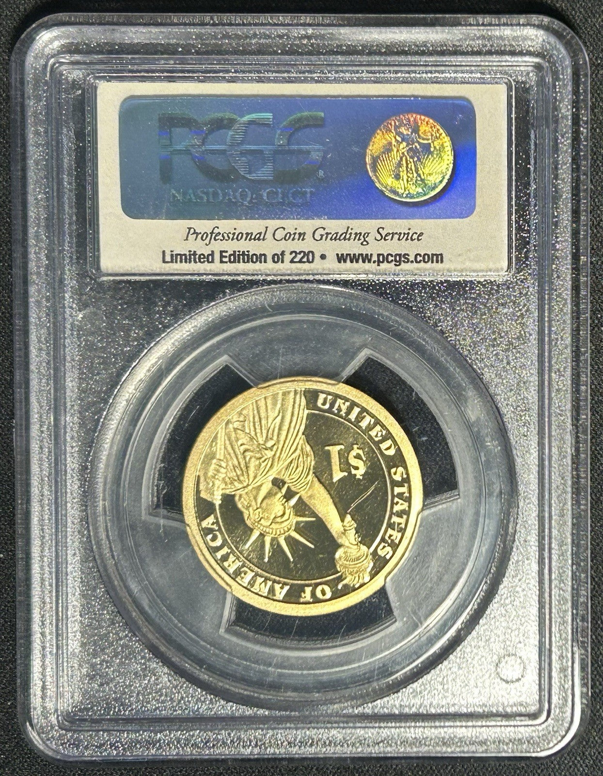 The product is a 2009-S $1 John Tyler Sample Slab PCGS ANA Luncheon Limited Edition Of 220. This coin features a presidential design with a proof strike type. Minted in San Francisco, it is certified by PCGS and is a unique variety showcasing John Tyler. As a limited edition piece, this coin and the holder holds value for collectors and enthusiasts of United States coins.